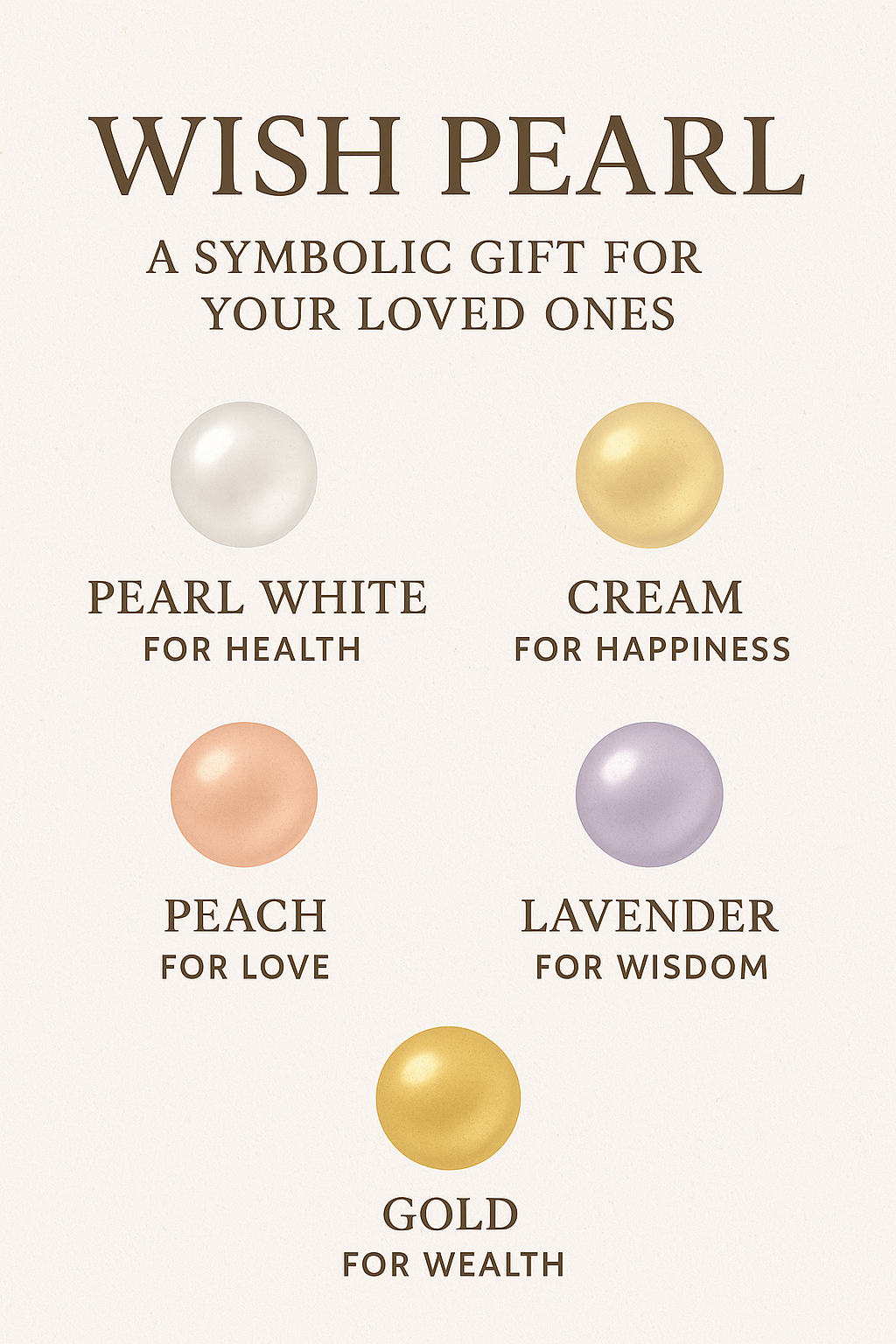 Each Wish Pearl comes as a beautifully packaged keepsake, with a pearl in one of five colors — each representing a meaningful sentiment: Love, Happiness, Wealth, Health, or Wisdom.